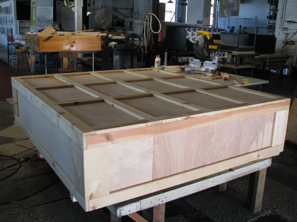 Isn't she gorgeous? Too bad no one will see the bottom once this thing is done and in use. But I am very happy with how it is coming along. It felt really good to just work hard today, use tools, and be in a more spacious space than the wood shop. Plus we had lots of music going and no one was underfoot b/c no one was at work besides a couple of volunteers making paper.