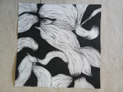 so much now that I have this quiet time and I get to do every step. Of course it's nice to be able to have someone else do the steps that seem the most tedious, but this way, I know everything I've done and in the end I can see why the paper works or doesn't. The magic has lasted to the very last batch that I peeled away from boards yesterday: I had a bad attitude about it from the start of formation, but then thought I could get away with it. It was a mix of mostly abaca, hardly beaten in a Hollander, plus Hollander beaten bleached Chinese paper mulberry. I knew it was a risk because hardly beaten abaca is not that nice and still lumpy and knotty. But the full day of formation went well, and then I loaded it into my press. I took pressure down like I always do but heard a strange squishy noise.