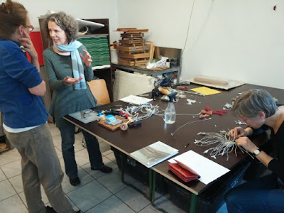 The last two days took me back to teaching variations of paper thread and cord. Annette, a textile designer from Bavaria, took SO very quickly to everything and was a huge help because she demystified the drop spindle for the rest of the class (I've never had the majority of students prefer that to the bobbin winder). Susan is also a textile designer and a quick study, also fantastic to have in class. And can you believe, Elisabeth in the background, far left, spent five years living in the US, in Cleveland? Small, small world. She worked and studied there and will be returning in May for a visit to see an old friend. All the circles close somehow.
