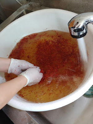 She is an expert safflower dyer so this was a big treat. She had already washed out much of the yellow in this precious dye and we could get to pink pretty quickly. She gets deep reds from this dye and her goal is to let people know that you can get brilliant colors from natural dye, not only browns and other subdued tones.