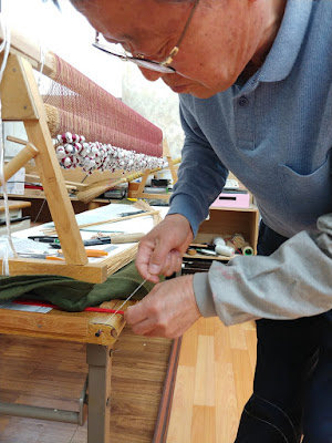 This is where he works standing up on giant screens. Those nuts and bolts are wrapped in aluminum foil before wound with silk threads and they are HEAVY. I only know because he made me weave a bit with him on my last day. At least he can watch/listen to the TV while working. I'm not good enough yet to be able to look away for long.